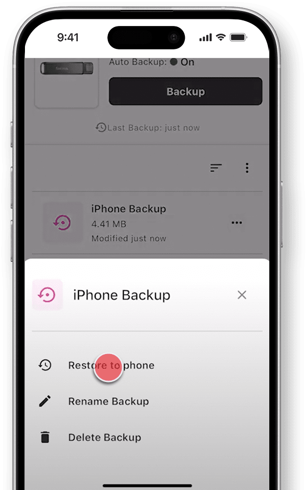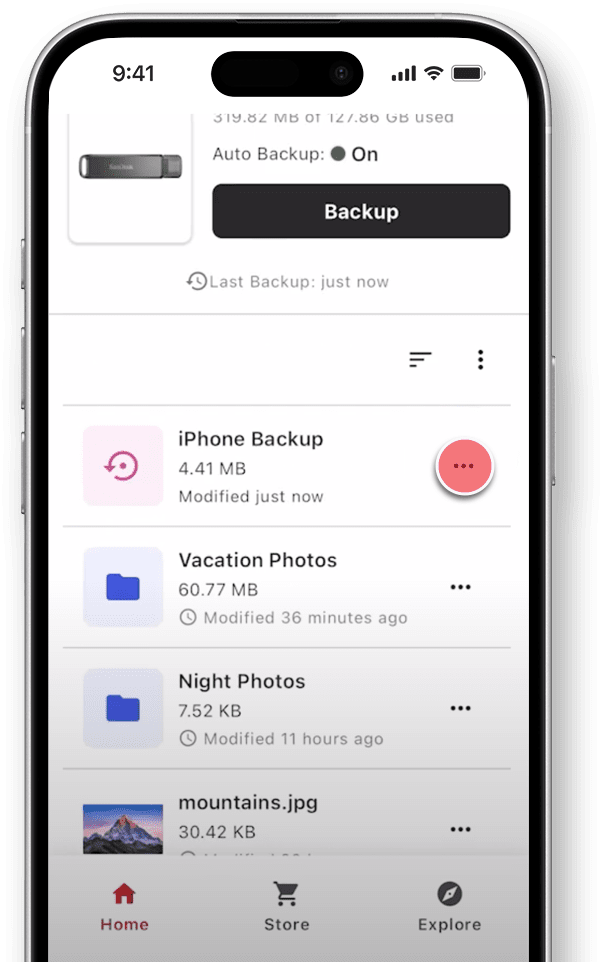 - Sur l’écran Sauvegarde, appuyez sur les trois points à côté d’un fichier et maintenez la pression